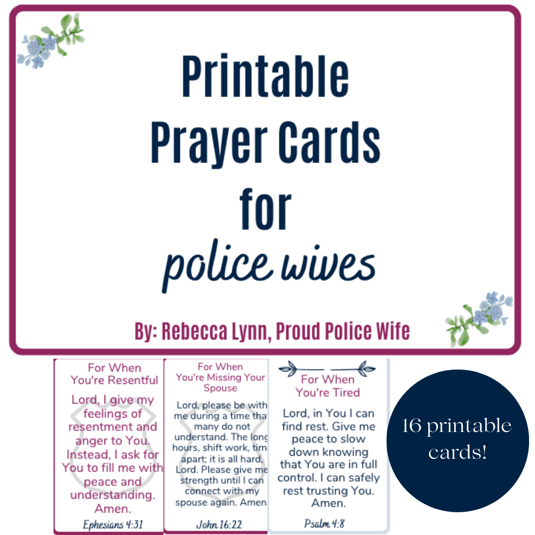 Navigate police wife life with encouragement & hope from God's Word. This digital download includes 16 printable prayer cards for you to print, cut out & carry as prayers with applicable Scripture. Each card has a focus topic for when you are anxious, tired, needing strength, worried, lonely, needing encouragement & more. Their size makes them perfect for carrying in your pocket or taping on your mirror or fridge.